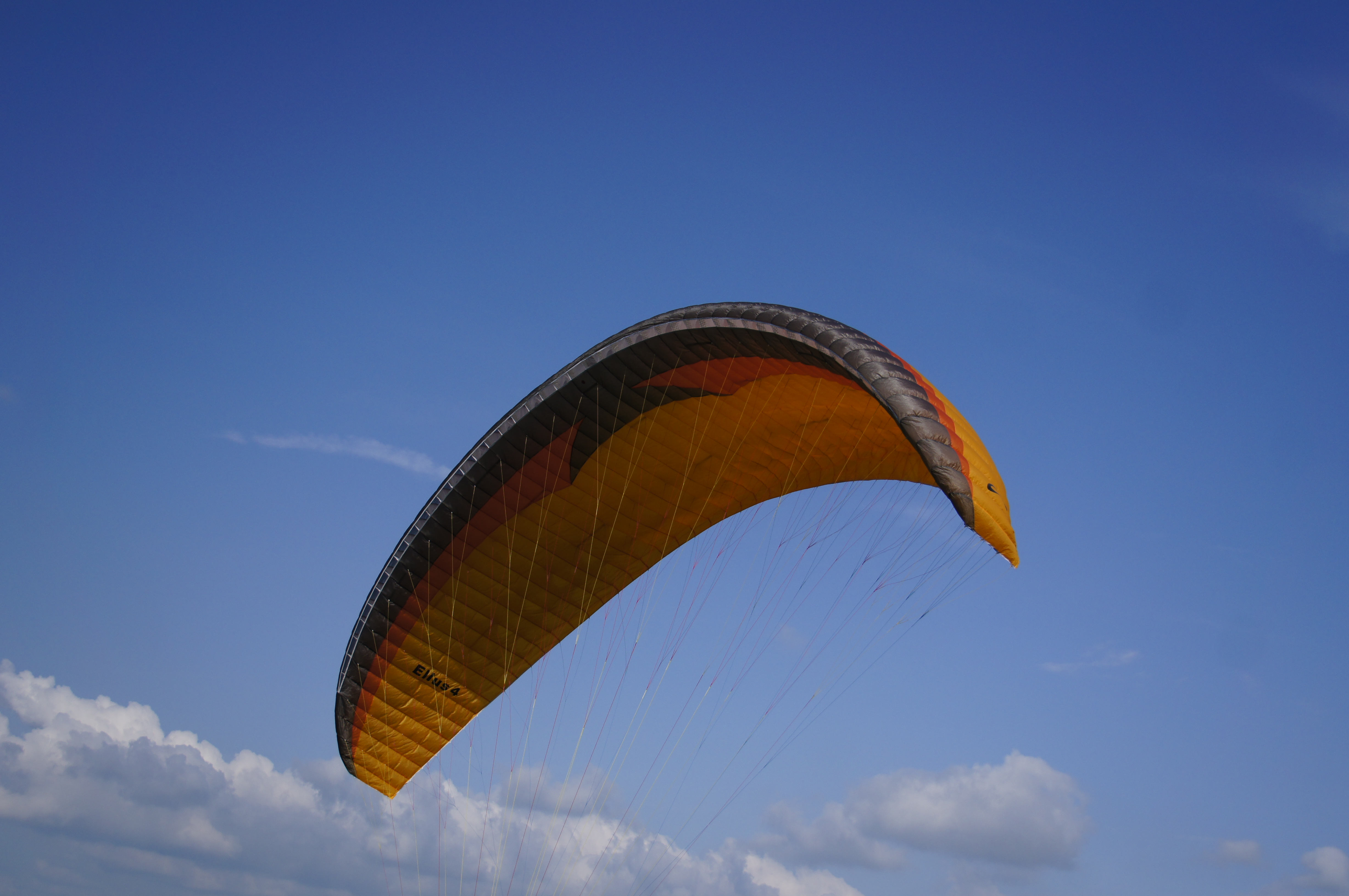 Comfort, informativeness. If the SOLs' signature drivability causes some bewilderment, the signature comfort is only a joy. In conditions of a thermal before thunder, the Ellus was doing very well, sometimes diving in pitch, while more serious vehicles were pitching up next to it. I have no problems with informativeness either - despite very good roll and pitch stability by today's standards, the Ellus transmits quite a lot of information to the brakes and noticeably "plays with" the speed. The Ellus's input is a little rough - it feels like you are flying into a wall - but after a short hesitation the plane breaks through the periphery of the stream convincingly. It's interesting that Ellus tends to flip out when entering narrow streams - it's behavior which is classical for paragliders of mid 2000's, but not very typical at the time of writing this test drive.