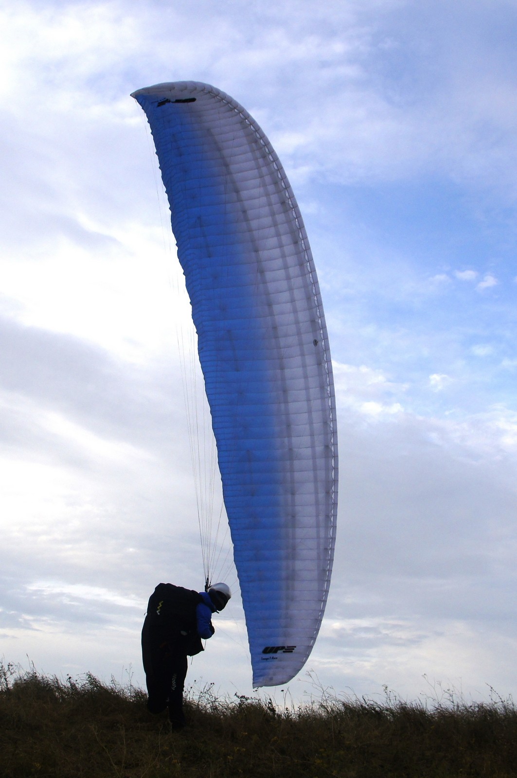Yes, this wing definitely needs some careful treatment! The trendy nowadays lightweight fabric slightly shines through with ripstop veins even under the cloudy Yutz sky. Under the direct sunlight the X-Race is almost transparent - so thin articles of Skytex are used on about 60-70% of the wing area. More or less unladen fabric (38 g/m2) is expectedly used only for the "forehead", which turned out to be white in the tested "Tranga" - probably this is another hint on the urgent need to treat this wing with care. I prepare the X-Race for the first flight into the Yutz speaker, examining the construction at the same time. There are not many external differences from the already familiar Trango XC3. Slightly changed the shape of the wing, getting fashionably bent upward tips of the "ears". Slightly different scheme of ties inside the wing. We are not surprised by the scant amount of unstitched slings on all tiers, but we are surprised by the loose ends with an unexpectedly long B-row that rolls over its own connector. All in all, the same but different.