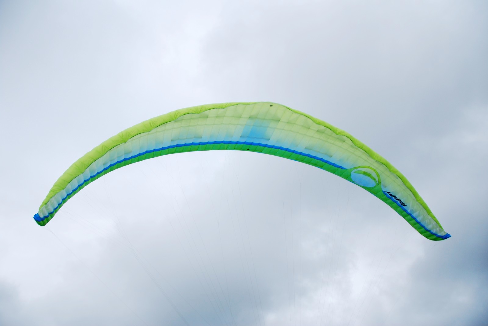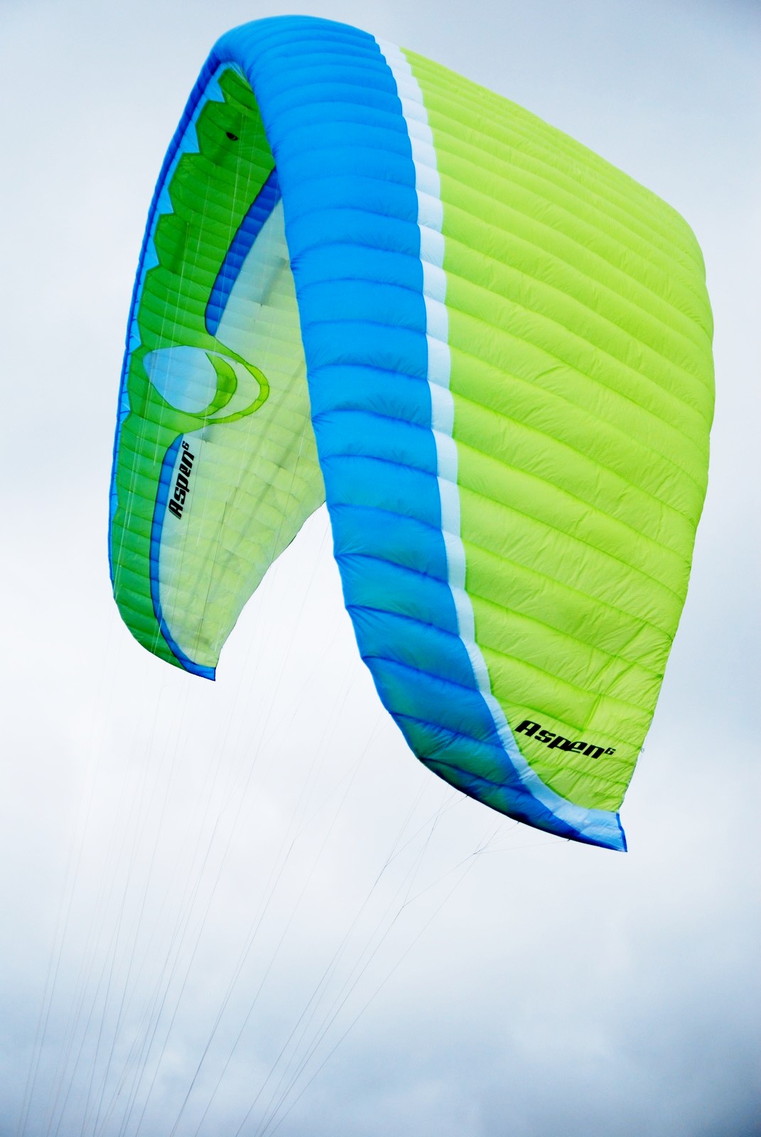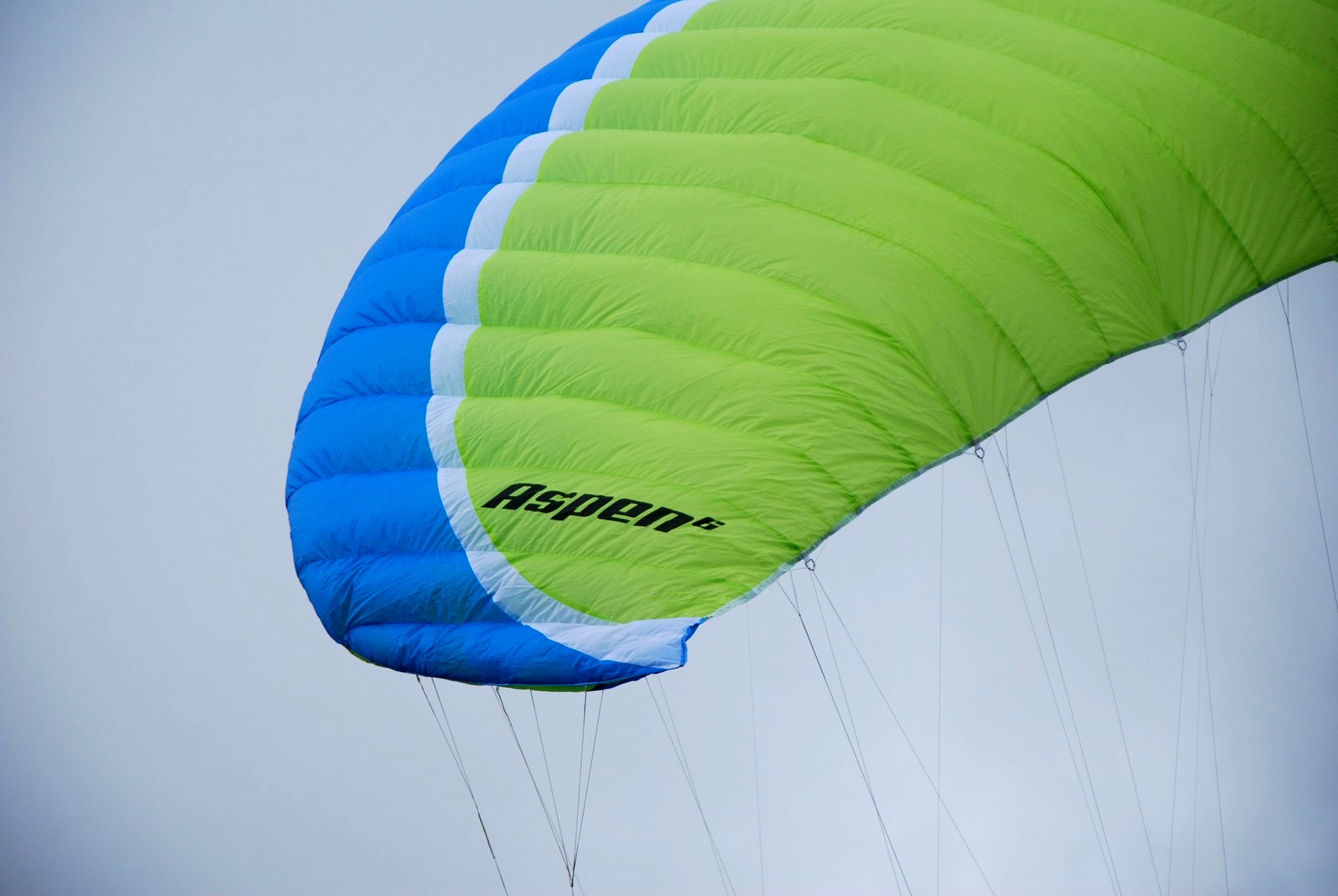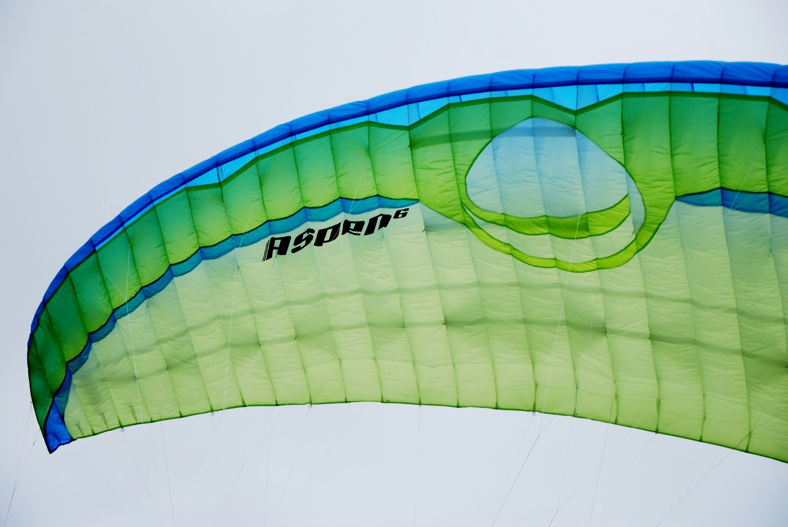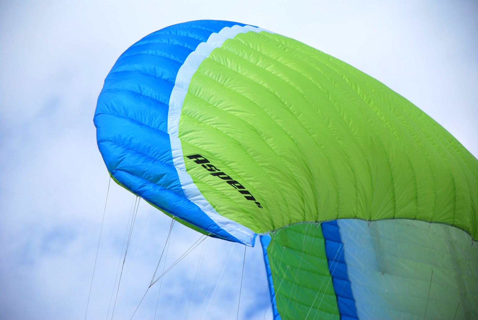 Сразу заметен явный и сильный прогресс в сравнении с более старыми Аспенами. Новый Аспен заметно обновил свой характер! С первых секунд «наземки» Аспен неожиданно впечатляет динамикой и остротой реакций. Плотный порывистый ветер заставляет Аспена мощно «стрелять» вперёд — но это движение можно практически мгновенно остановить клевантами, которые очень эффективны. Для подъёма достаточно несильного движения руками или даже рывка корпусом. Форсировать подъём работой за две центральные A-стропы нет никакого смысла — и без того аппарат выскакивает в полётное положение мгновенно. Через полминуты игры с крылом начинаю понимать, что Аспен буквально провоцирует меня на разные энергичные движения, с ним скучно стоять на одном месте, даже если можешь и умеешь (а это не так просто с таким динамичным крылом). Даю аппарату заскочить слишком вперёд — сложение возникает моментально, достаточно резко, но так же моментально и резко раскрывается. Интересно! Игра с Аспеном в касание ухом земли требует хорошей (по меркам класса EN C) координации движений и быстроты реакции, но если всё это есть — то аппарат выполняет то, что от него требуется, мгновенно и очень точно. В целом ощущения балансируют где-то на грани между радостью от точности и быстроты реакций и лёгкого загруза от них же. Несколько смахивает по ощущениям на Кайенн Пятый, но всё же чуть попроще.