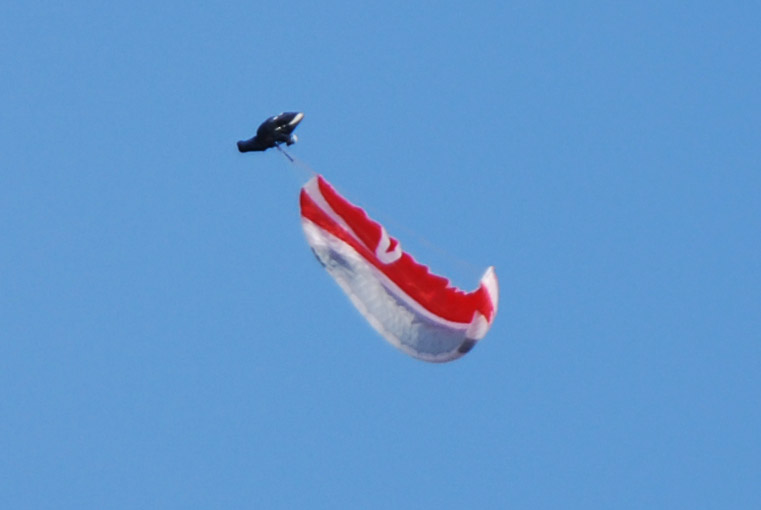 Отлично. Развить сложение глубоко по хорде малореально; а то, то удалось сложить, очень быстро раскрывается немедленно после бросания рядов. «Уши», впрочем, могут оставаться сложенными, но в любом случае выход происходит мягко и несколько растянуто по времени. Потеря высоты на выходе из режима — метров от силы 15−20, часто меньше. Выход во всех попытках происходил строго симметрично.