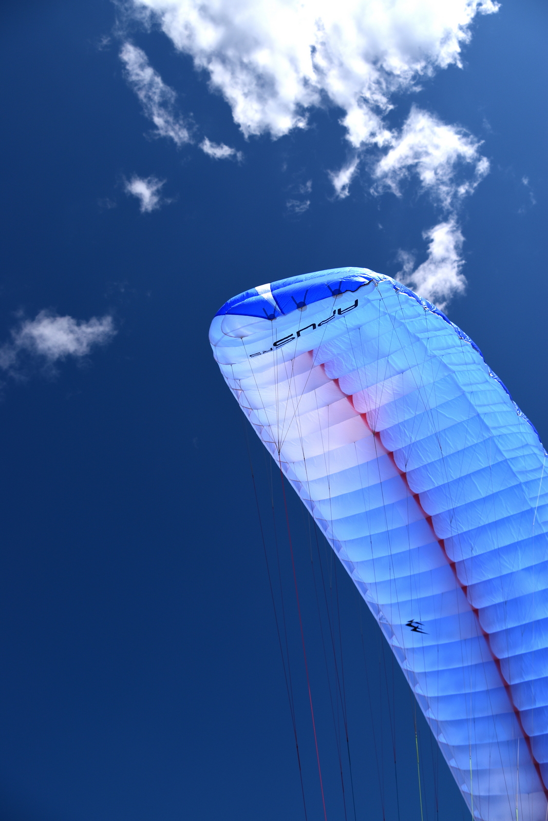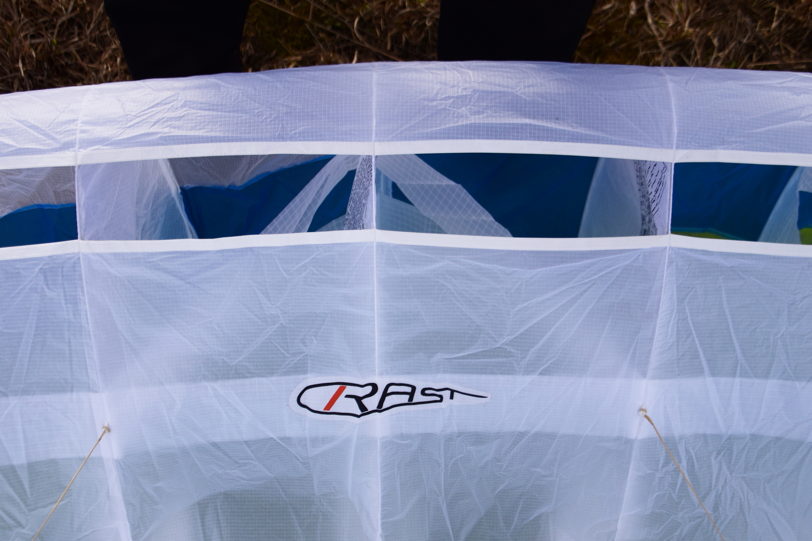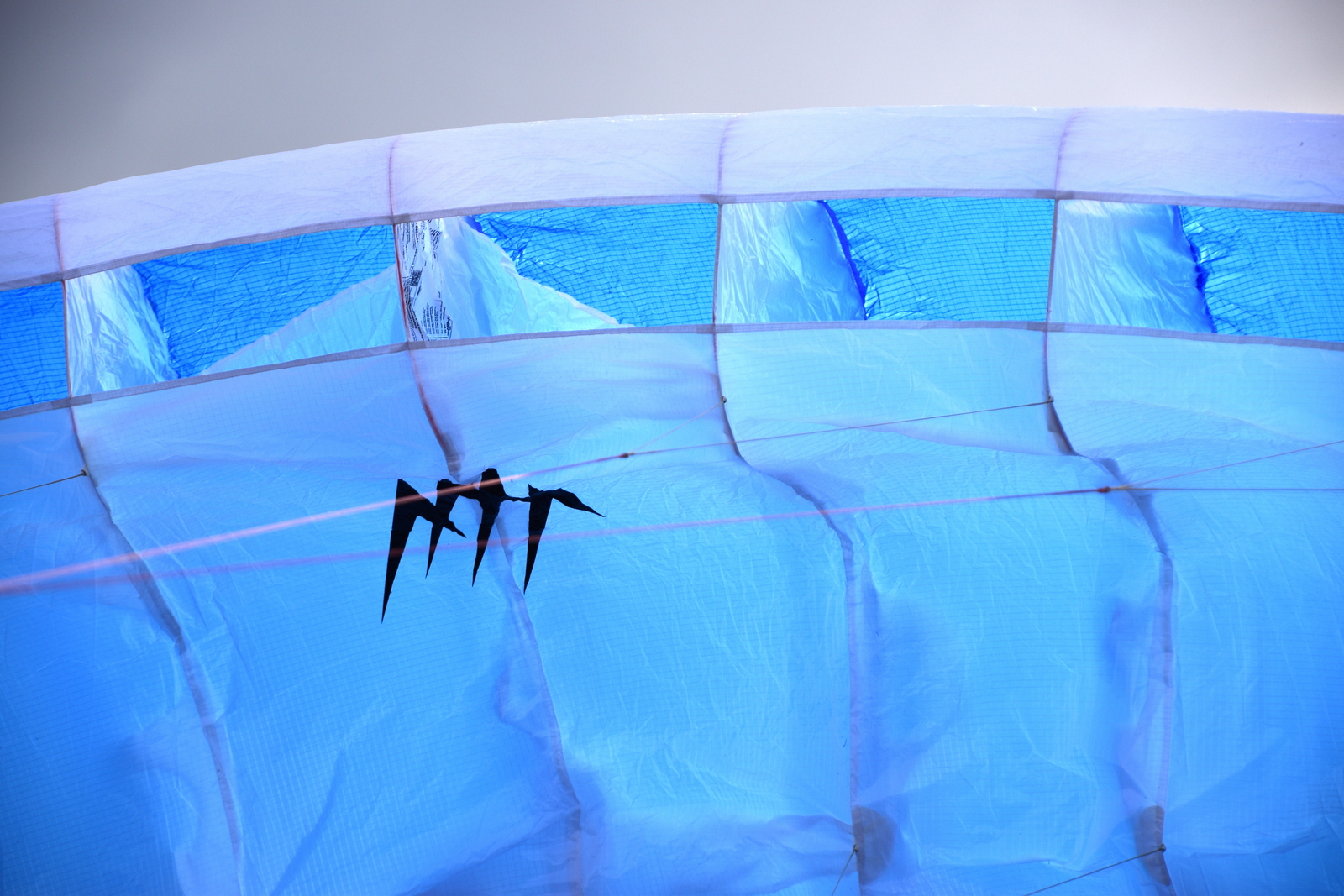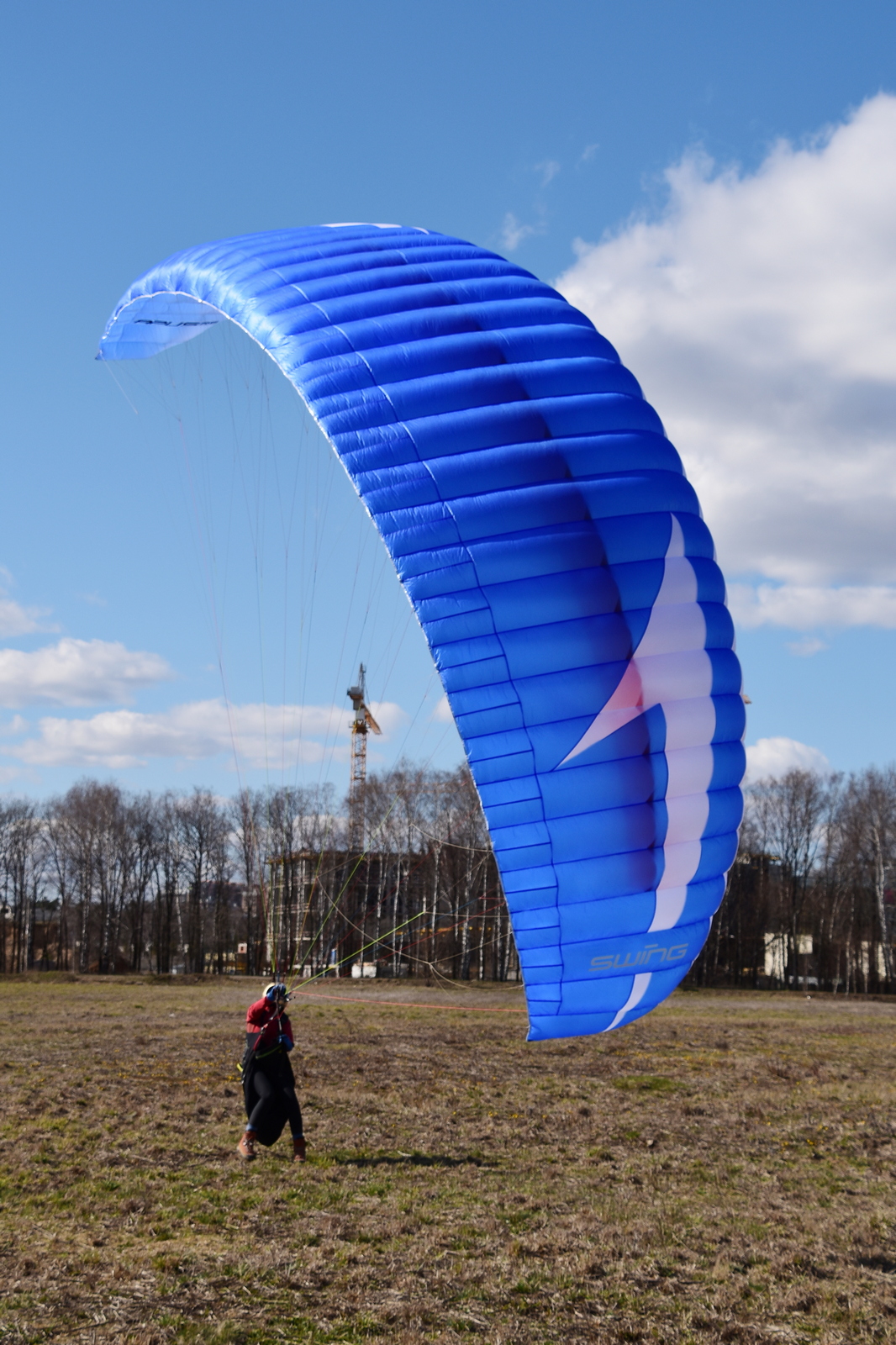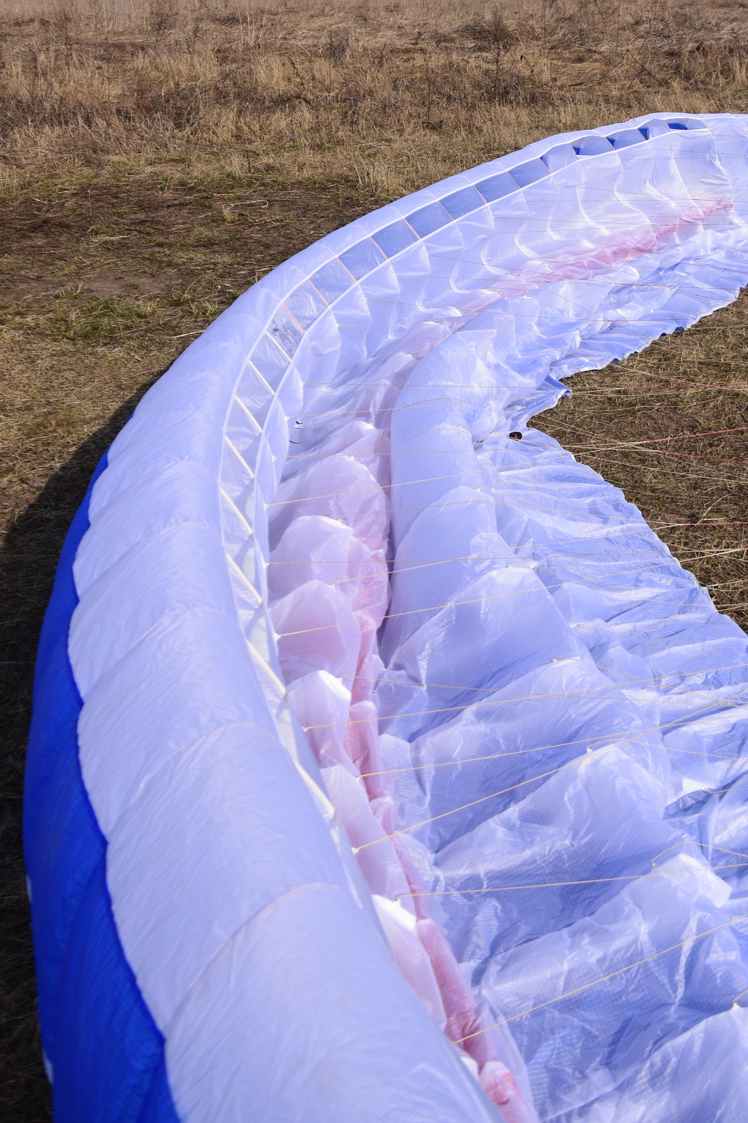 Первое впечатление — конструктор решил отдохнуть сам, а заодно и создать ощущение релакса и каникул у апусовладельцев. Удлинение 5,0 — в 2020 году оно уместно либо для несложных минивингов, либо для совсем-совсем учебной техники. Ну, Апус-то как раз и принадлежит к обоим этим мирам, так что всё в порядке. Секций — 34 штуки: тоже практически привет из 90-х, но такому простому крылу больше и не нужно. Как, и это всё? Нет, конечно! Более внимательный взгляд обнаруживает в крыле уже ставшие классикой лески в передней кромке, дополнительные полунервюры по задней кромке, а по центру крыла, просвеченного насквозь весенним солнцем, бросается в глаза огроменная — во весь размах — контрастно покрашенная перемычка. Да, детка, это RAST! По сути — клапан, пускающий воздух внутрь задней части хорды, но почти не выпускающий его обратно, когда крыло хочет сложиться. Малое удлинение положительно сказалось на состоянии поверхности: чтобы неплохо её разгладить, вполне хватает тридцати с чем-то секций. Никаких намёков на шарк-ноуз обнаружить не удалось, равно как и прочих модных штучек вроде почти прямой передней кромки или чуть загнутых вверх кончиков «ушей». В плане формы крыла в плане Свинг показывает себя твёрдым, последовательным консерватором. Зато узнаваемо! Качество изготовления — без претензий.