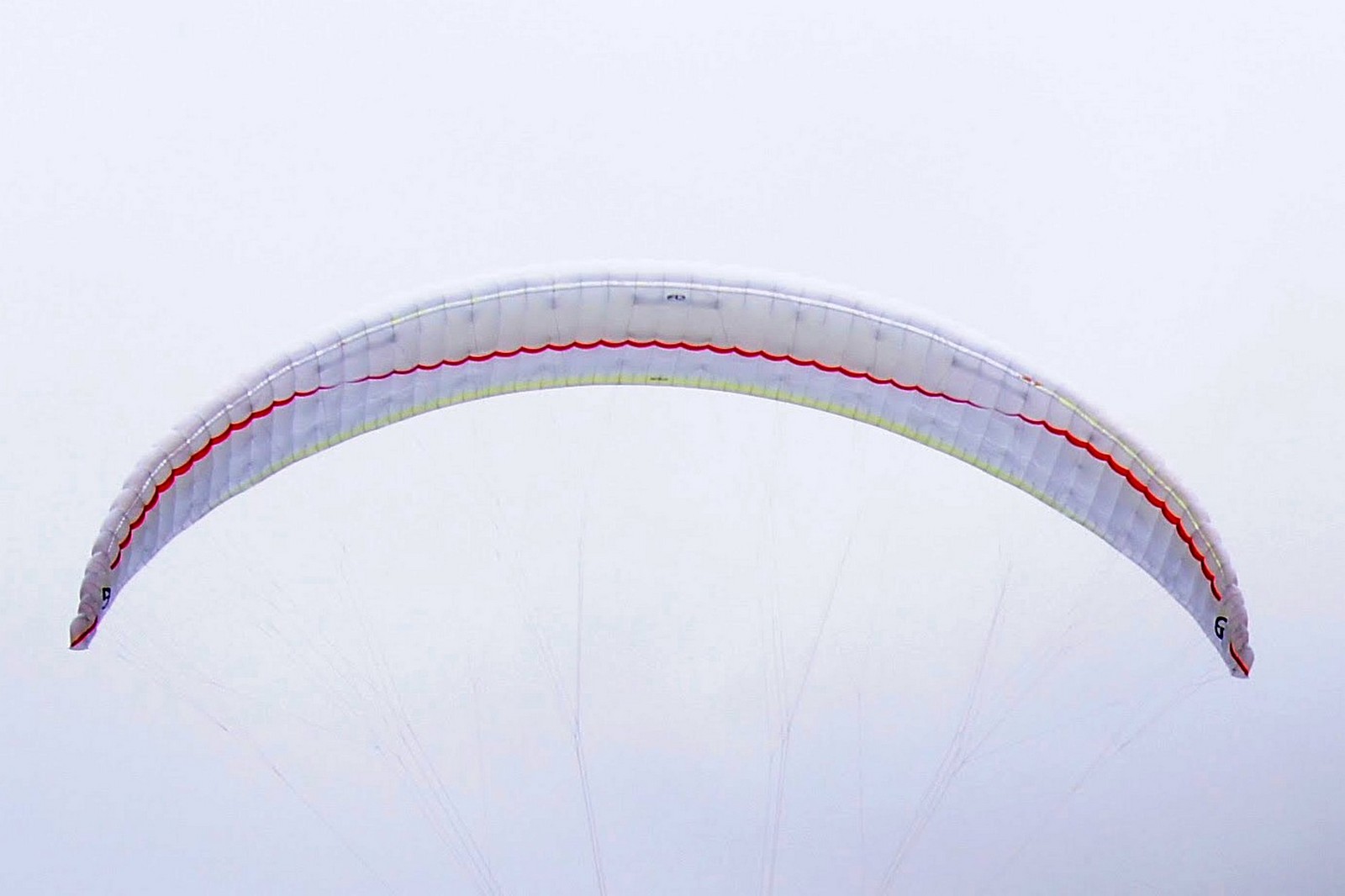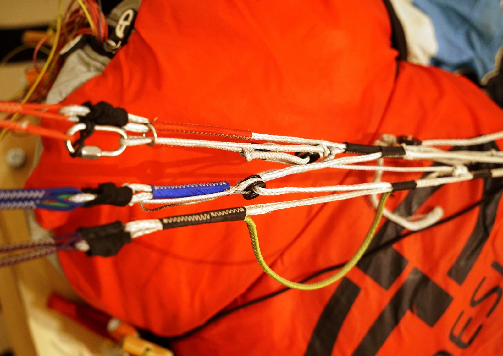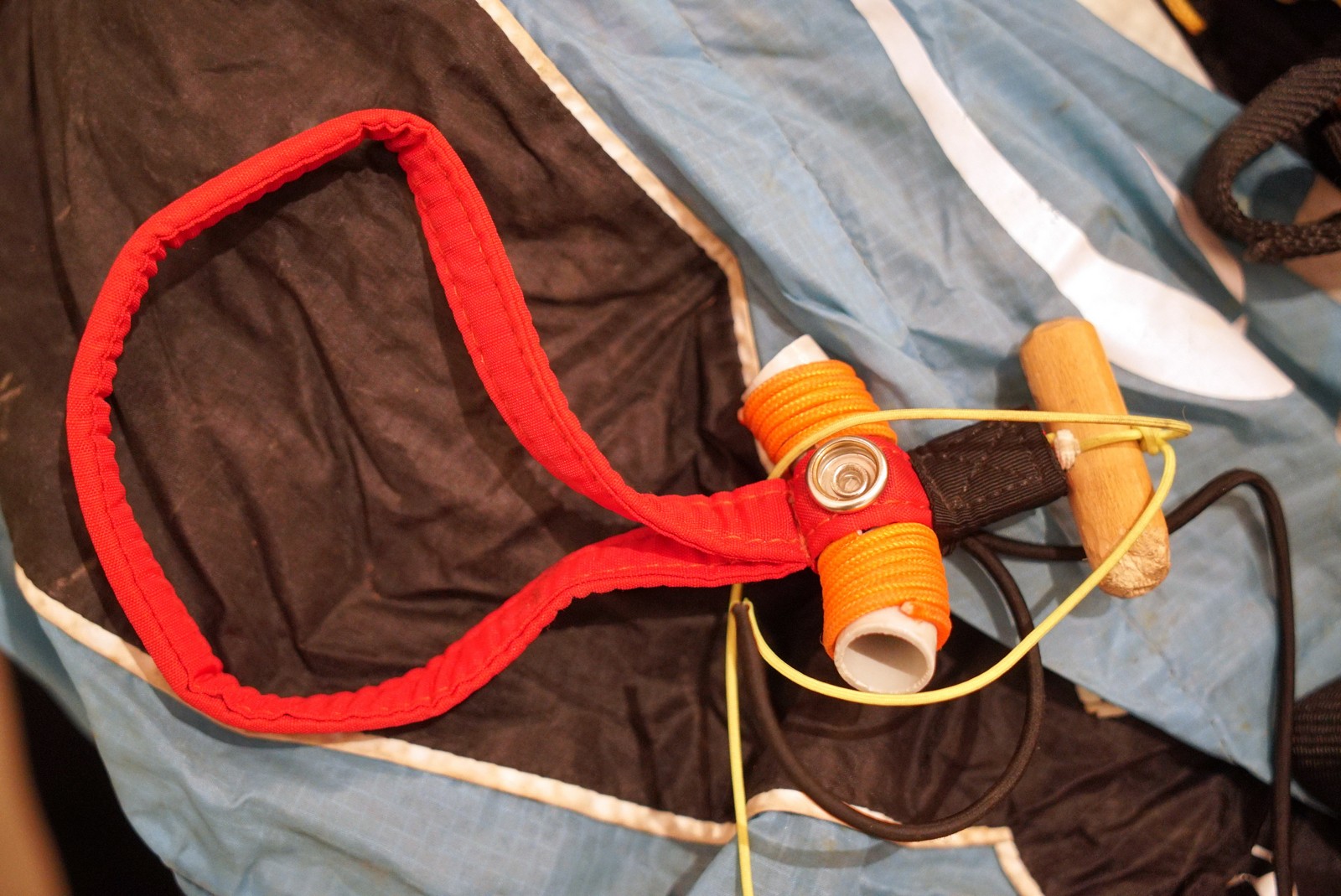 Size M, fork 90-105kg. Weight 3.2kg (actually less - 3.150). With the concentrina about 3.250. The concentrina is small on ½ wing, very handy. It could be made from an even thinner cloth. You can see the basic specifications on the manufacturer's website. The loose ends are leros ropes. The front row is highlighted in red. Everything is clear and straightforward - no tricky stuff. The brackets are thin and very comfortable - I didn't change them for my old ones. I only added the control sticks, I'm very used to them. These have great stitching on the dagger, just plug it in, and that's it. The clutch blocks to increase the stroke are on a separate 10 centimeter leash. The factory set length is optimal for most pilots. I'm more used to flying with acro type rubbers and higher paddles. That's why I changed it. Didn't affect gas pedal performance. The fit is perfect in my opinion. The entire wing is made of the same denomination. The plastic reinforcement is only in the forehead.