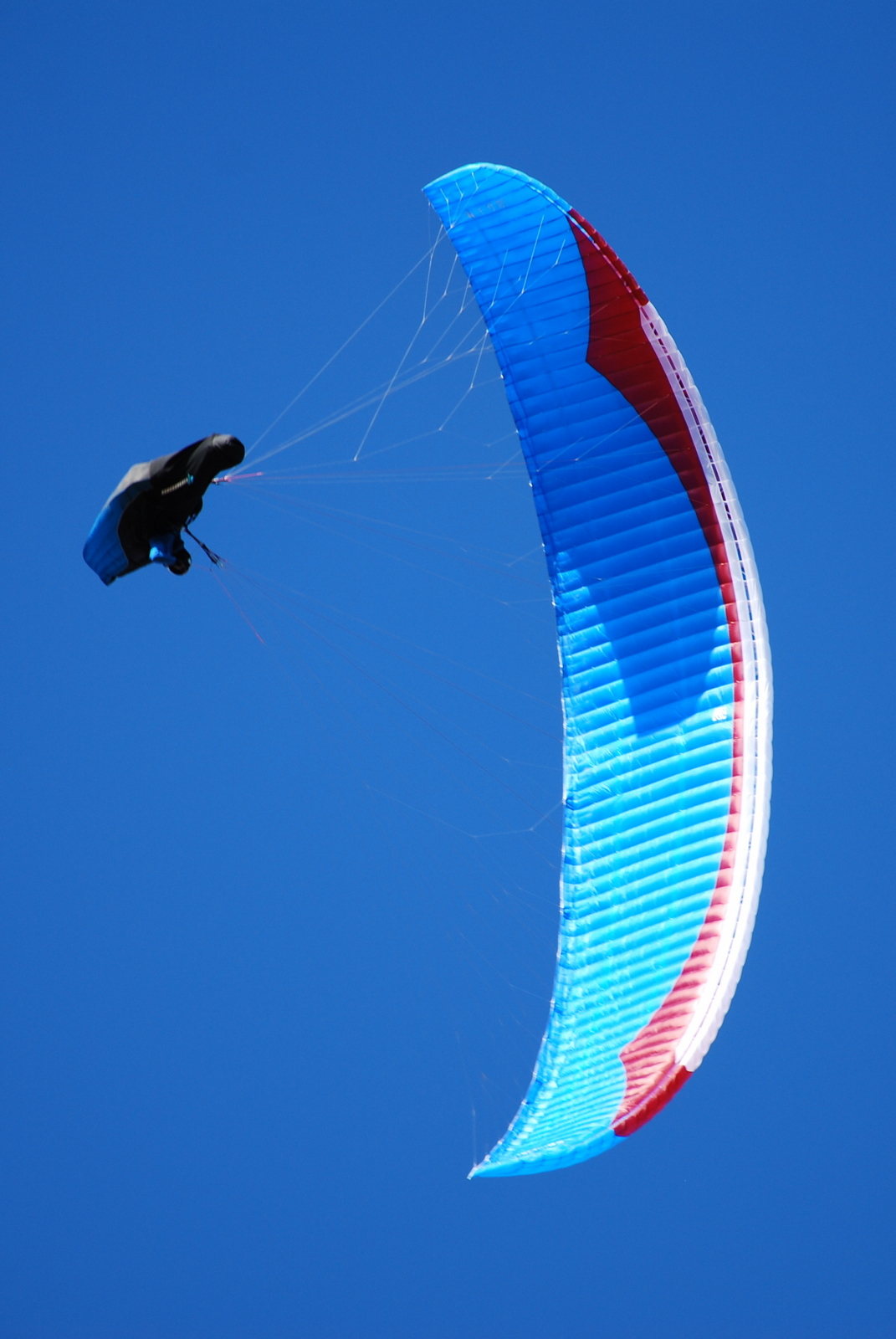 Хай-тек! Первое, что бросается в глаза — очень сложная кинематика. Работа акселератором влияет на геометрическую крутку крыла сложным образом — акселератор по-разному действует не только на отдельные стропы A-ряда (что уже давно стало распространённым решением). Примерно то же самое происходит и с B-рядом! Внешняя его стропа «живёт» на выделенной ветви свободных концов, и при выжимании акселератора эта стропа втягивается чуть больше, чем весь остальной B-ряд. Пожалуй, столь хитрые концы встречались мне раньше только у FreeX Oxygen. Проводка акселератора изготовлена из мягкой и скользкой дайнимовой стропы. Передняя, наиболее нагруженная часть проводки скользит по качественным подшипниковым блочкам; задняя (влияющая как раз на B'-стропу) вместо блочков имеет более компактные и лёгкие, но создающие бОльшее трение керамические колечки. Та же комбинация дайнимы с колечком использована и в поводках клевант, которые здесь достаточно длинные и позволяют эффективно использовать перенос руки наружу или внутрь виража. Клеванты — большие и удобные, на качественных, залитых в пластик магнитах. Качество изготовления… ну, это же Джин! Придраться сложно, даже если очень захотеть. Хотя лично меня чуть-чуть смутил тот факт, что у одной из протестированных Бонанз вообще не было ручек для подруливания задними рядами в полёте на акселераторе. У другого экземпляра ручки были — но маленькие, скромненькие. Такому амбициозному крылу больше пошли бы какие-нибудь шары или бобышки. Но это уже из области придирок.