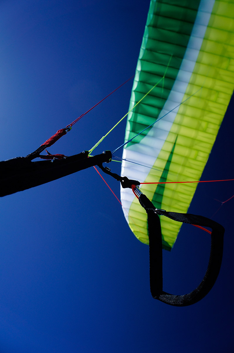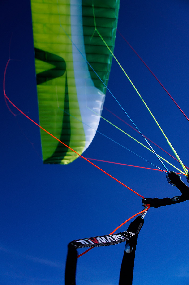 Манёвренность. Упомянутая в преамбуле приятная острота относится прежде всего к манёвренным свойствам подопытного. Приятно нагруженные клеванты по мере опускания рук приятно и предсказуемо тяжелеют, приятно, быстро и предсказуемо заводя аппарат в упругий, чёткий вираж. Аппарат, не задумываясь, вполне точно идёт за рукой. В целом поведение подопытного на вираже отличается некой особой «прозрачностью» — знакомство с крылом в сложных условиях незнакомого склона не потребовало и минуты привыкания, общий язык с крылом удалось найти практически мгновенно, с первой же термической спирали. Реакция на вес у Чили более спокойная, но тоже чёткая, понятная и предсказуемая. Нарастание снижения по мере сужения радиуса спирали у Чили невелико — верный признак хорошей летучести крыла. Легко угадываются в вираже этого крыла и фирменные скайвоковские черты. Короткая дача одной руки приводит к быстрому провороту крыла над головой и к почти моментальному изменению радиуса спирали. Возникает ощущение, что можно ввинчиваться в поток как угодно узко, не опасаясь сорвать — и это ощущение близко к правде. Подозреваю, что «виноваты» в таком поведении в основном профилированные отверстия в районе 80% хорды, называемые громким словом «джет-флэп» — это некий аналог самолётных закрылков.