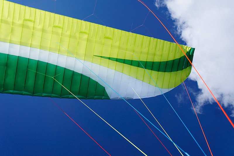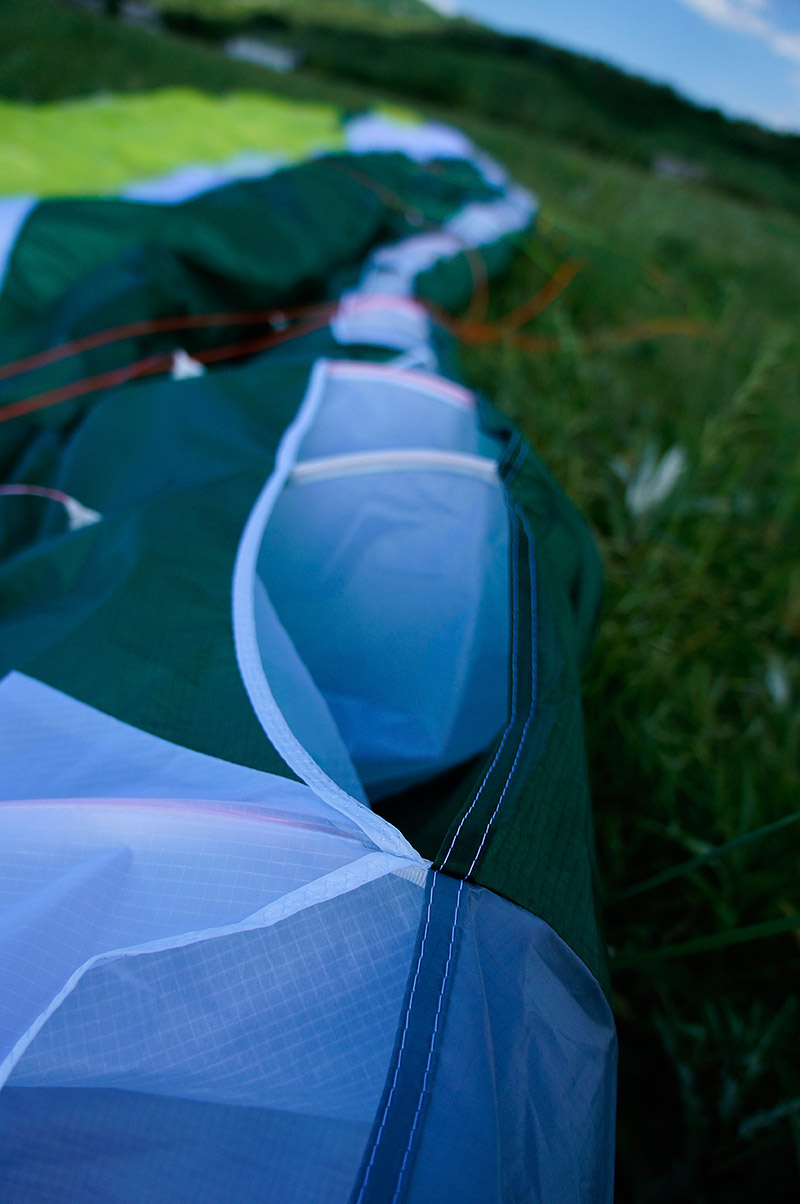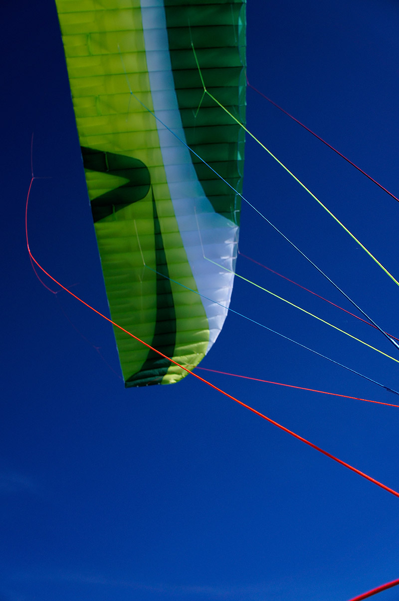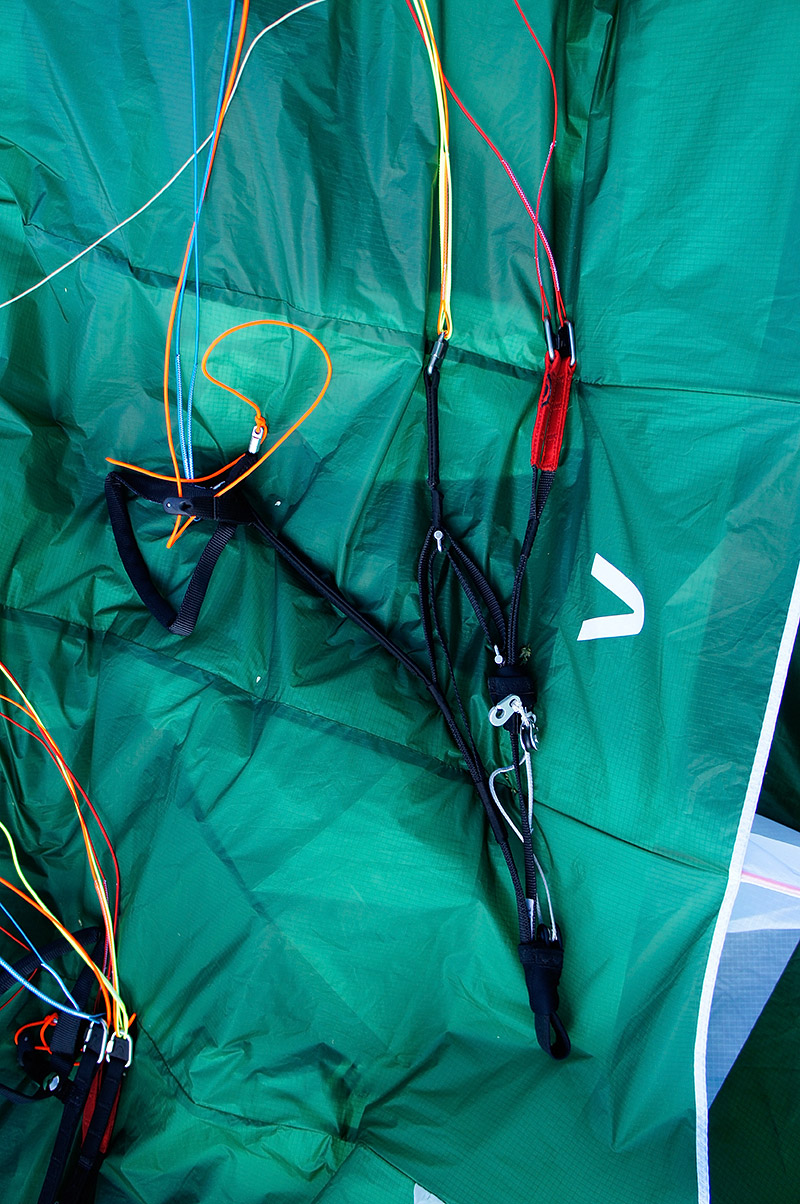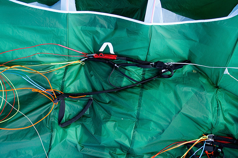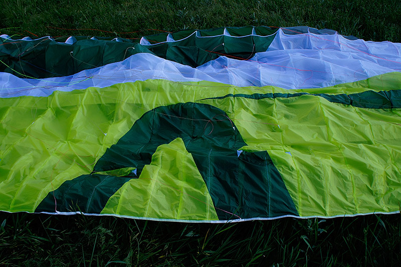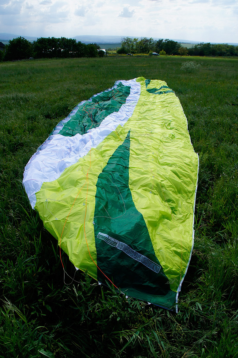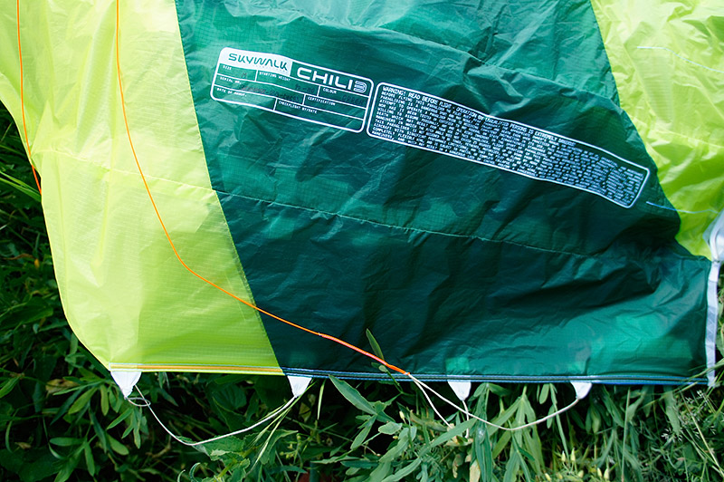 Будучи извлечённым из упаковочного мешка пронзительно-зелёного цвета на такую же пронзительно-зелёную майскую травку, Чили поначалу несколько даже пугает своей хай-течностью. Здоровенные жёсткие лески, уходящие от красиво скруглённых заборников сантиметров на 30−40 назад по хорде. Дополнительные, тоже довольно длинные лески в районе C-рядов (осторожно, укладывать в концертину аккуратно!). Красивая, с лёгкой благородной хищностью, форма крыла. Удлинение для современного EN B вполне разумное, без ужасов. Арочность — тоже. А вот стропление, похоже, упёрлось в разумные минимумы: на A-рядах всего две стропы, а схема стропления — трёхрядная. Схема стропления: A1A'1B3C2. Стропы по верхним ярусам в основном безоплёточные, что, конечно, уже не удивляет, но всё равно впечатляет. Концы — узкие (15 мм), очень добротные. Приятно порадовали скользкий Лирос в проводке акселератора и неопреновые чехольчики для нижних роликов.